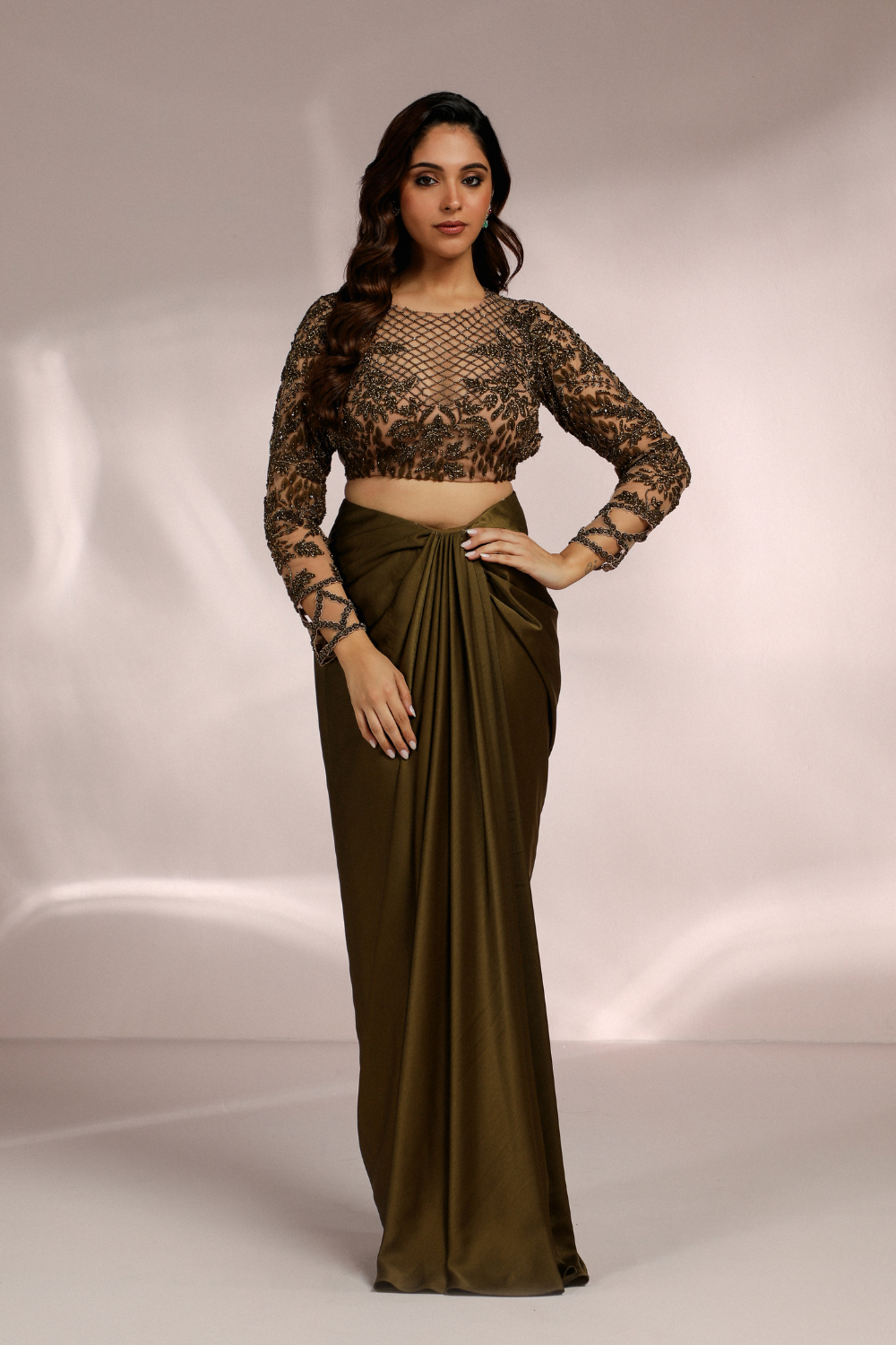 Vanshika Mehta in OLIVE GREEN DRAPE SKIRT AND BLOUSE