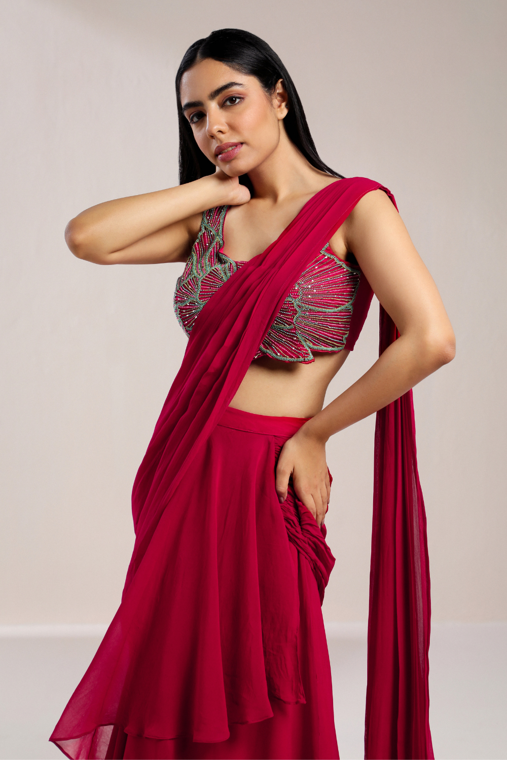 HOT PINK DRAPE SAREE AND BUSTIER SET
