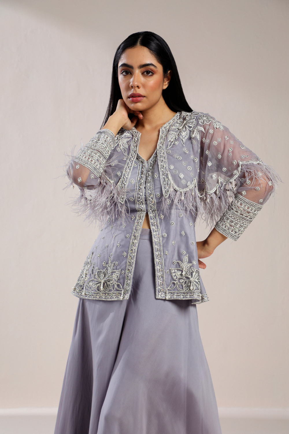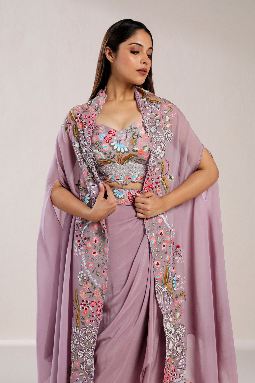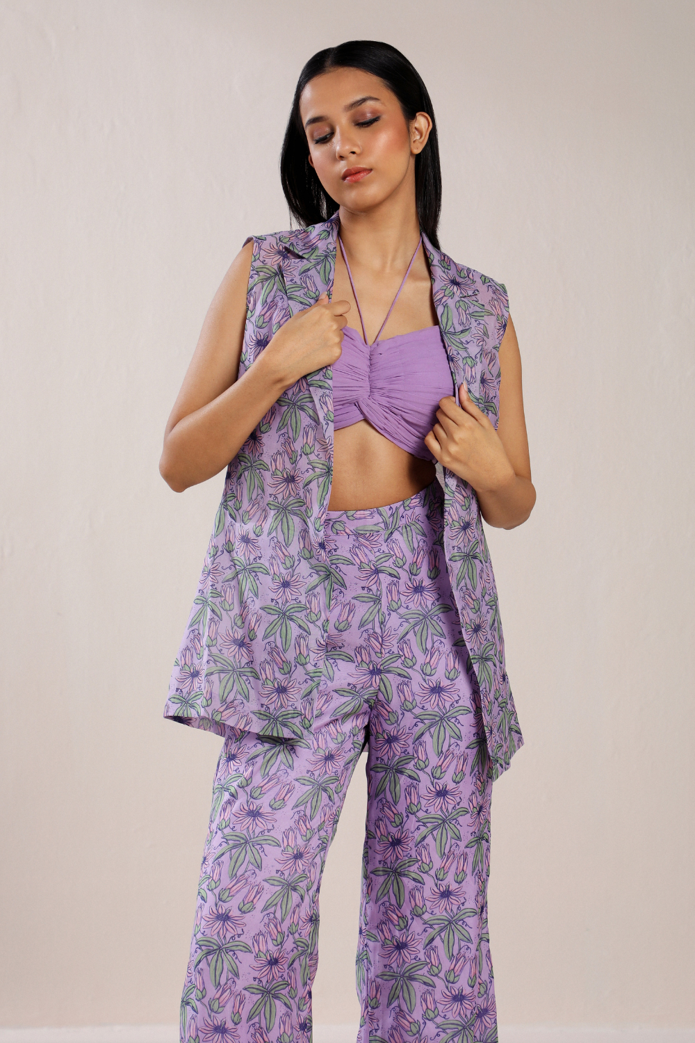 LAVENDER PLEATED BLOUSE WITH PRINTED JACKET AND PANTS