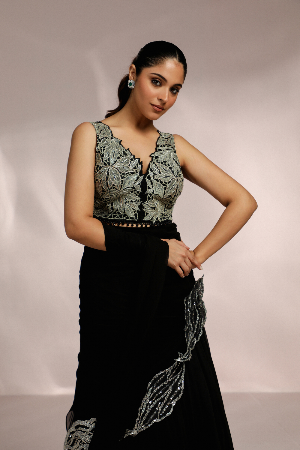 BLACK CUTWORK LEAF BLOUSE WITH DRAPED DUPATTA SET
