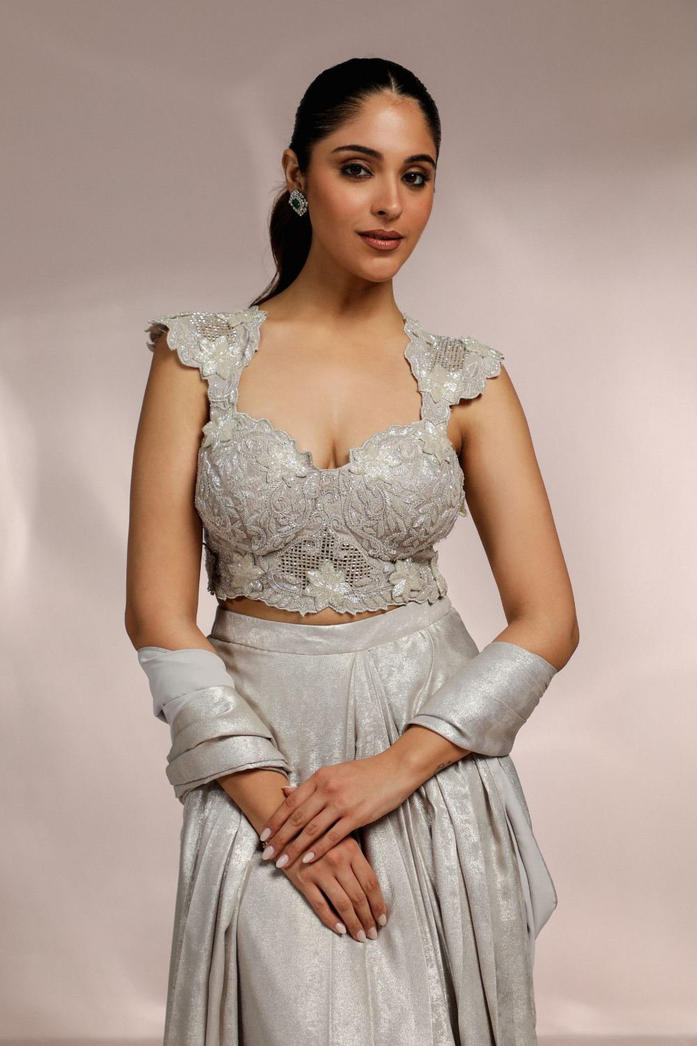 SILVER METALLIC DRAPED SAREE WITH CUTWORK BLOUSE