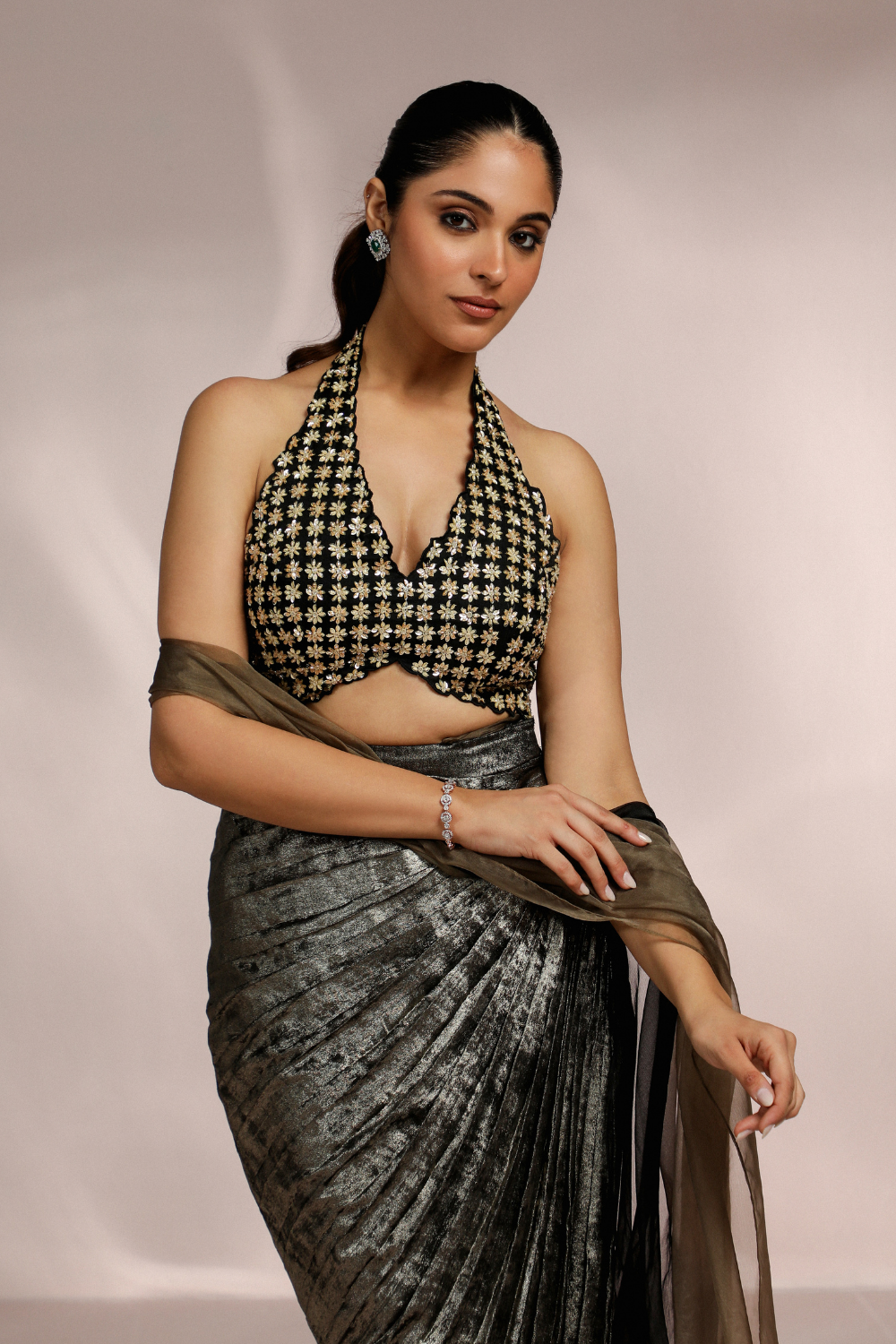 GOLDEN METALLIC DRAPE SKIRT WITH HALTER BLOUSE