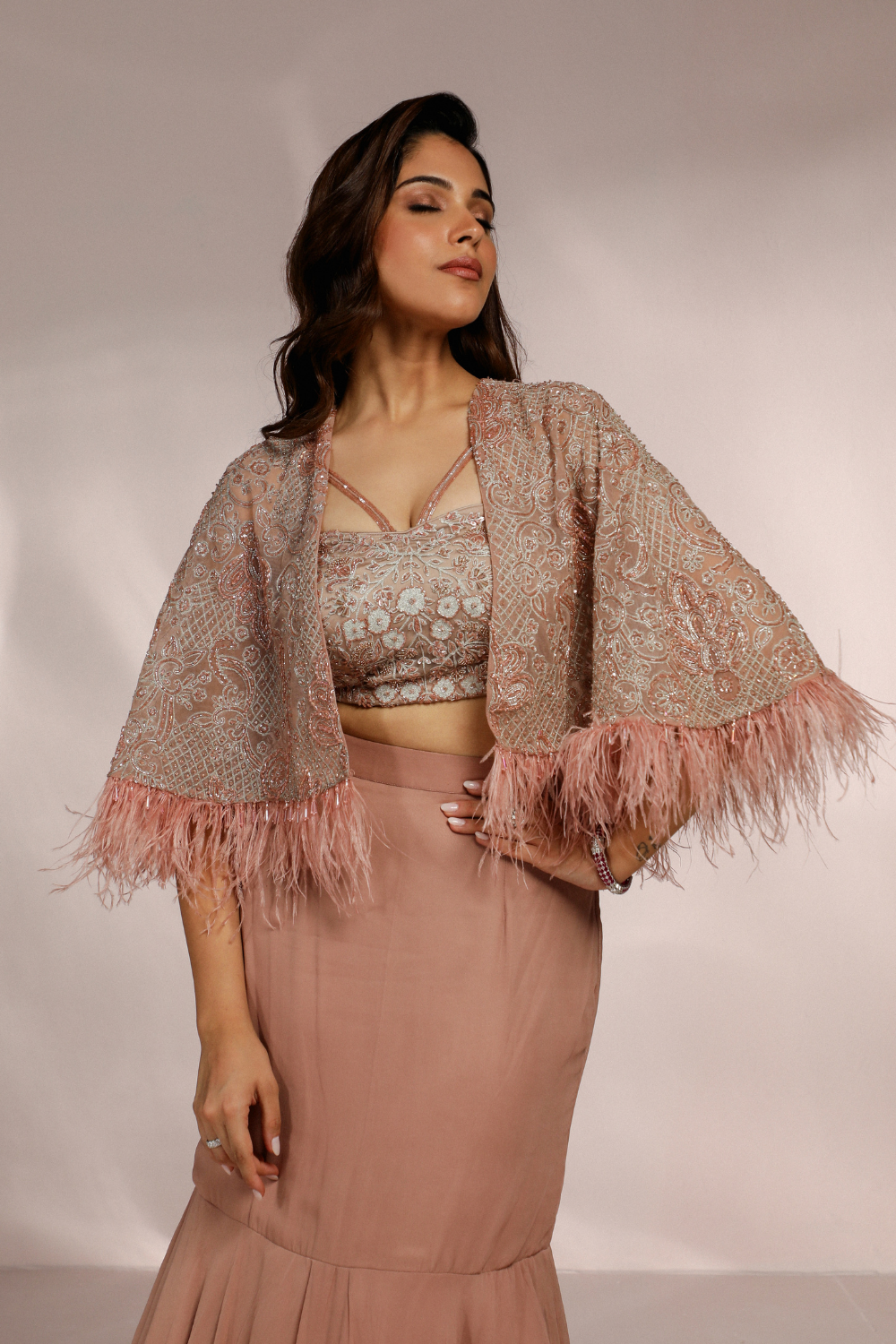 PRE STITCH SAREE WITH BUSTIER AND CAPE JACKET SET