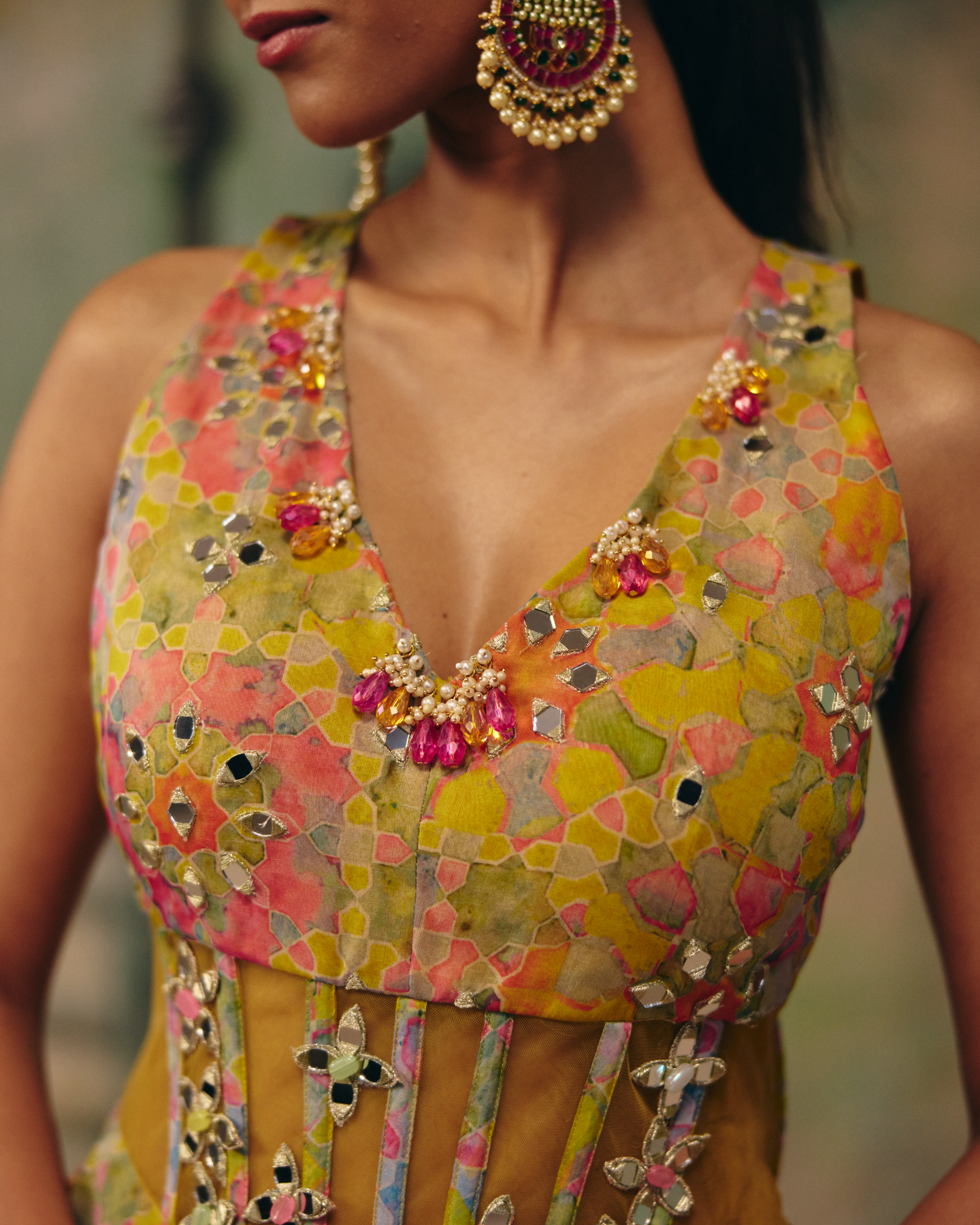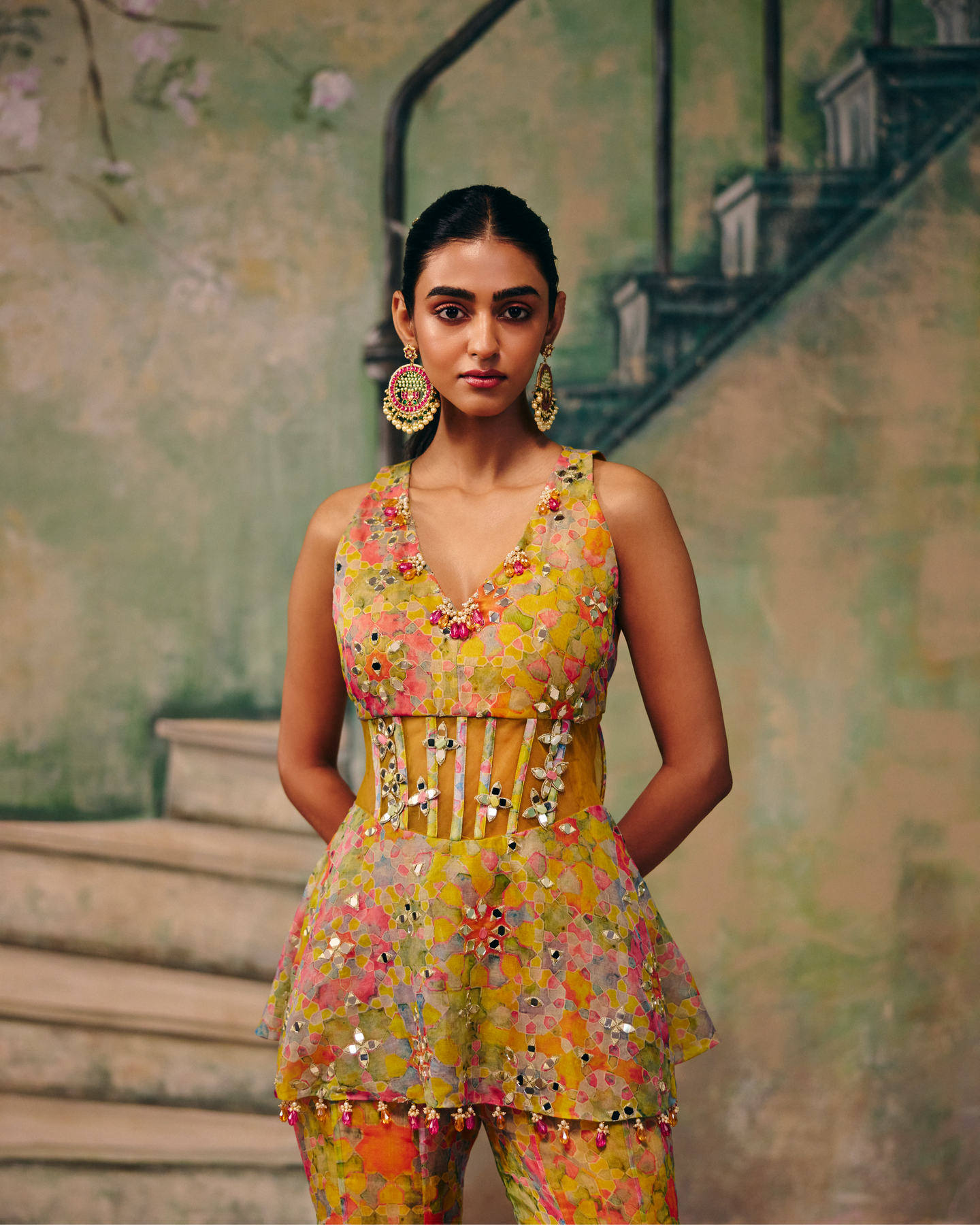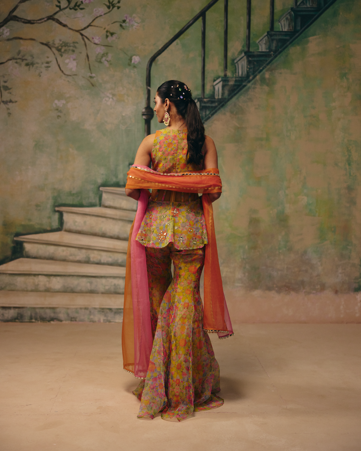 This Statement Ensemble Features A Sheer, Multicolour Floral Peplum Top With Intricate Mirror And Embroidery Accents. The Structured Corset-Inspired Waist Adds Definition And Contemporary Allure. Paired With Fluid, Floor-Grazing Flared Pants, It Creates An Elegant, Elongated Silhouette. A Perfect Fusion Of Modern Couture Aesthetics And Festive Elegance.