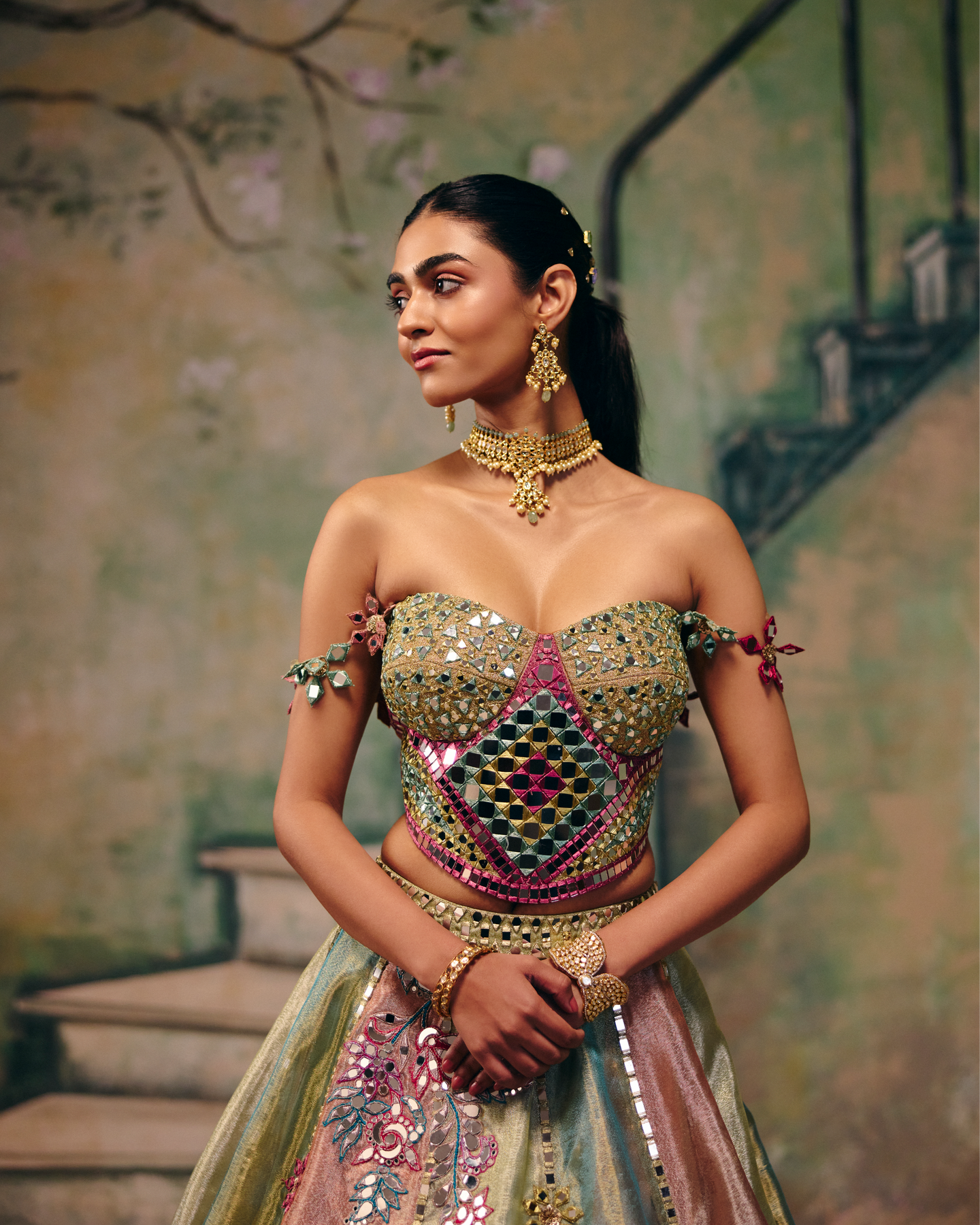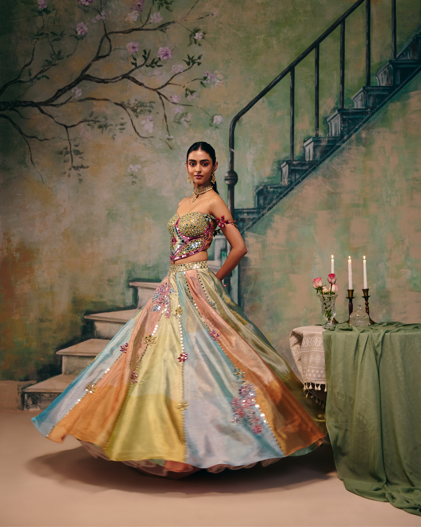 This Striking Lehenga Showcases A Sculpted Strapless Blouse Richly Adorned With Intricate Mirror Work And Fine Embroidery, Creating A Bold Couture Statement. The Voluminous Skirt Features Pastel Organza Chanderi Panels Highlighted With Delicate Floral Motifs And Shimmering Accents For A Luminous, Fluid Effect. Playful Tie-Up Details On The Arms Add A Touch Of Contemporary Charm. A Perfect Blend Of Modern Artistry And Festive Elegance, Designed To Turn Heads At Every Celebration.