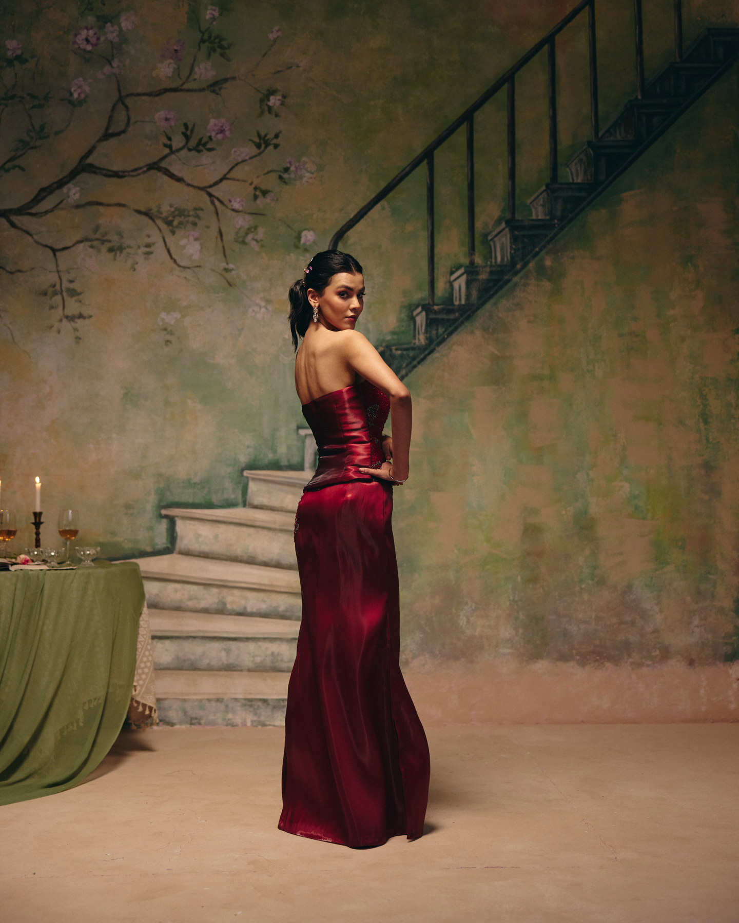 This Striking Ensemble Features A Sculpted Strapless Corset In Deep Wine Red, Richly Embellished With Intricate Detailing For A Bold Couture Statement. Paired With A Fluid Skirt In A Matching Tonal Finish, It Creates An Elongated, Elegant Silhouette. The Contrast Of Structure And Softness Adds Modern Drama And Refined Allure, Making It Perfect For Cocktail Evenings, Receptions, And High-Glamour Celebrations.