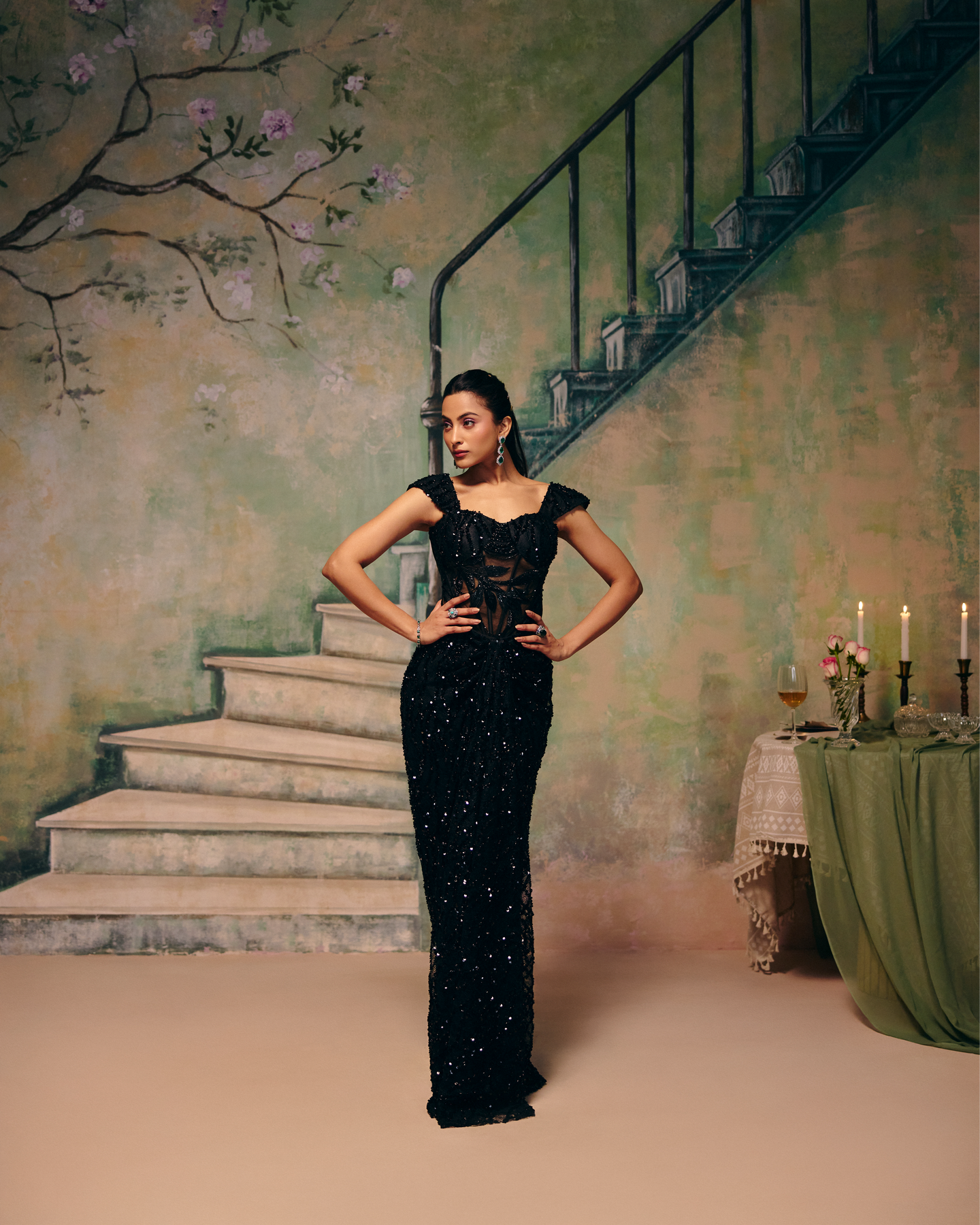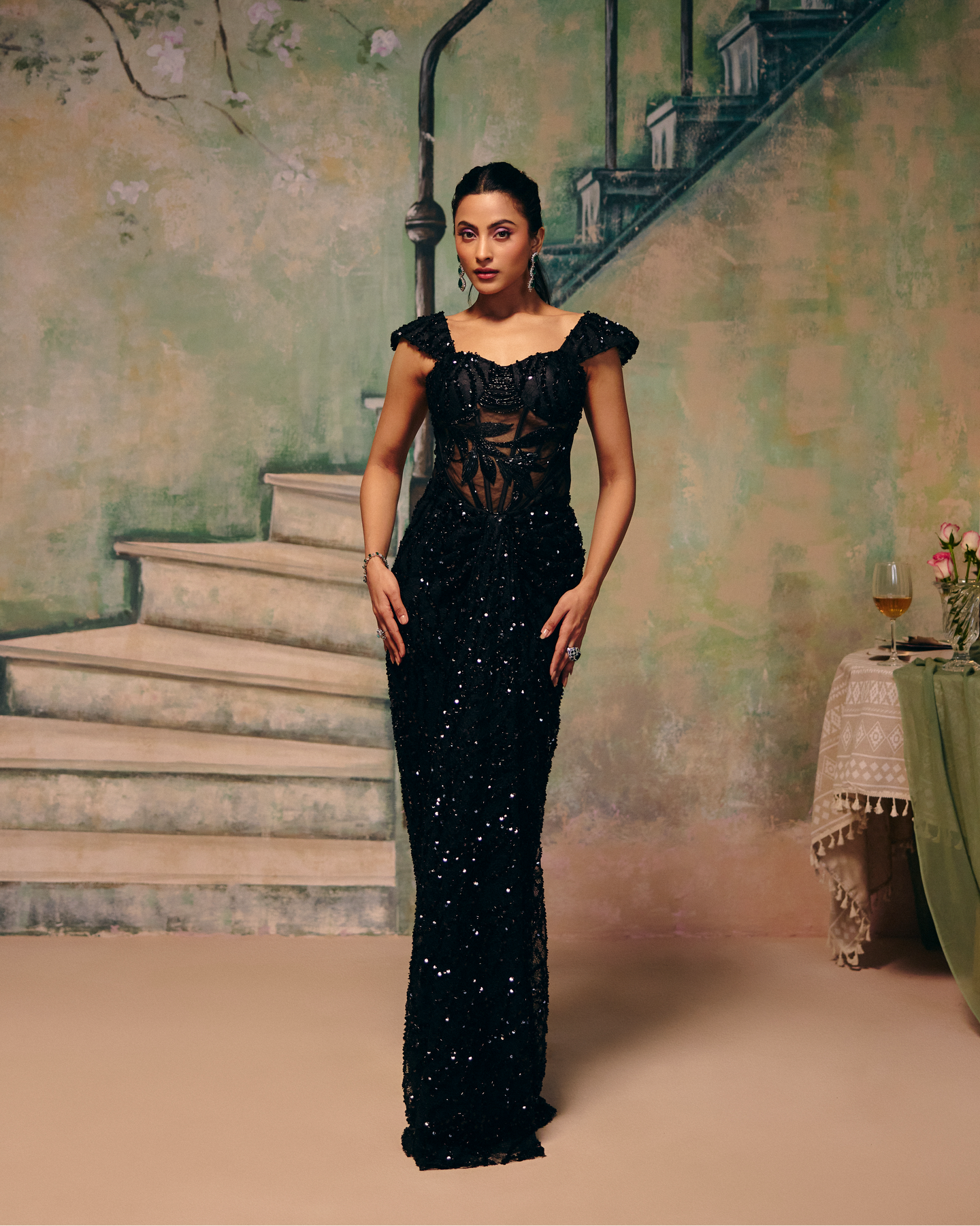 This Bold Two-Piece Ensemble Features A Sculpted Corset Top In Heavily Embroidered Illusion Net, Accented With Sequins And Beadwork For A Dramatic Couture Finish. Paired With A Sleek, Drape Skirt, It Creates A Powerful, Elongated Silhouette With Fluid Movement. A Striking Blend Of Sensuality And Structure, Designed For High-Glamour Evenings And Statement Occasions.
