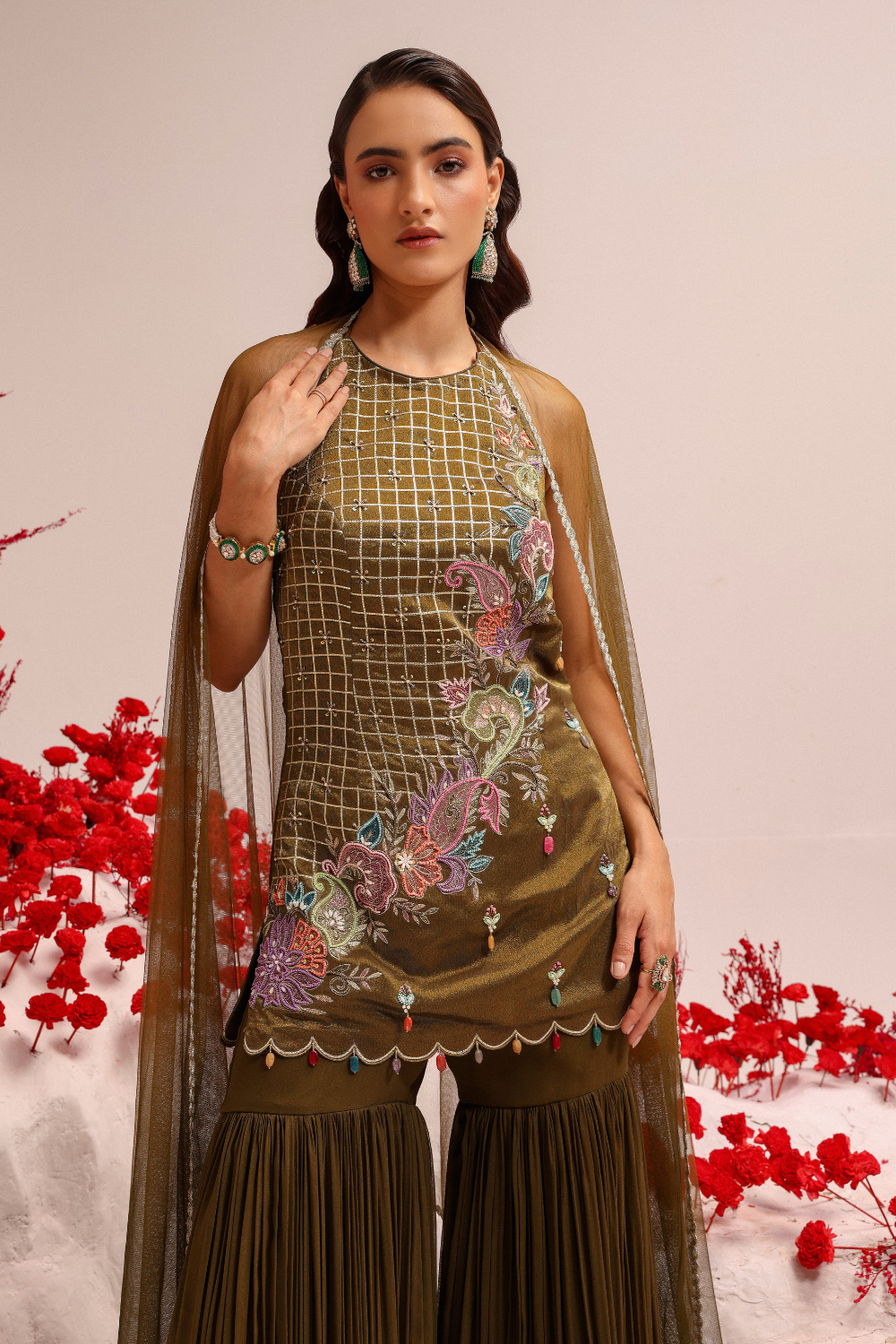OLIVE GREEN PRINTED KURTA AND SHARARA WITH DUPATTA